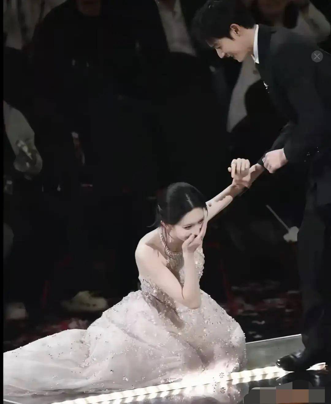 谁能想到,这位“内娱全自动闯祸机”爬起来的第一件事竟是对着话筒苦笑:“去年摔了今年又摔,明年我高低得焊死高跟鞋!”一句话把尴尬炸成全场笑声,身旁的白鹿转头时眼睛瞪得溜圆,憋笑的表情被镜头精准捕捉,当晚就被做成“人类早期驯服面部肌肉珍贵影像”表情包。更绝的是下台后,孟子义捂着脸跺脚的样子被拍下来,配文直言“挺疼但无大碍,就是太丢人了”,这组生图愣是凭真实感刷爆社交圈。